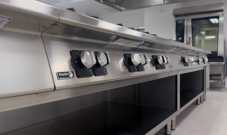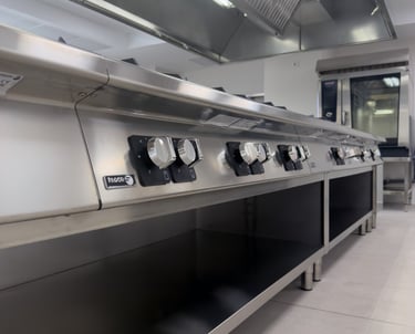 Reforma integral de los diferentes espacios, adaptándonos a las nuevas necesidades operativas del cliente. Destaca la bancada monobloque para elaboración de paellas, fabricada en acero de 3 mm de espesor, garantizando resistencia, limpieza y durabilidad.